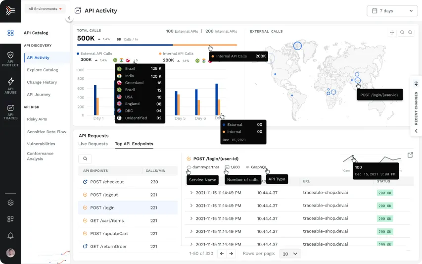 Traceable provides a security risk score to every APIs, which allows you to understand which of your APIs are most vulnerable to abuse. The platform does this by collecting data on runtime details such as sensitive data flows, API call maps, API usage behavior, user details, event details, threat activity levels, and more.