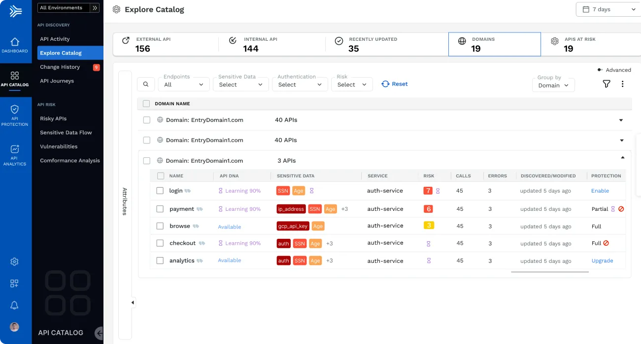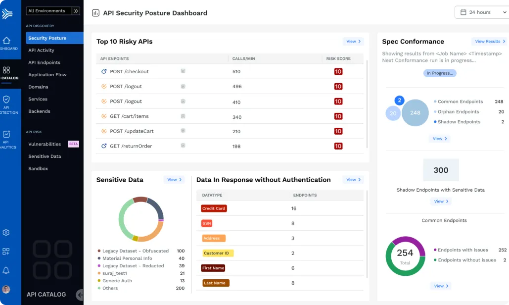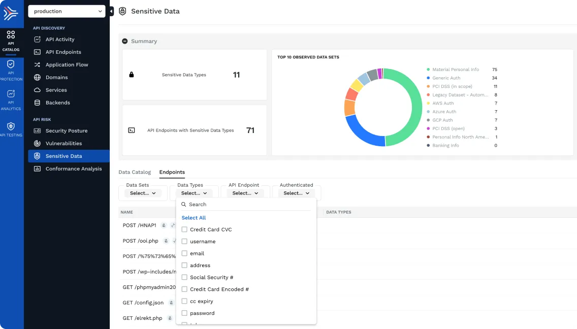 API Catalog allows compliance, risk and privacy teams to obtain visibility into sensitive data exposure. This provides for more audit and compliance efficiency.